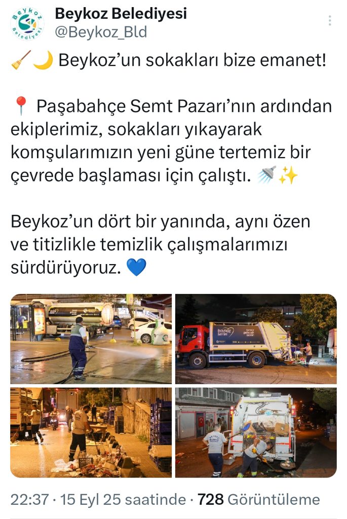 Beykoz Belediyesi resmi X hesabından yapılan açıklamada pazar sonrası yapılan temizlik paylaşıldı.