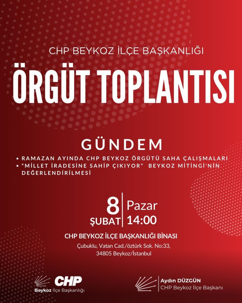 CHP Beykoz İlçe Başkanlığı, yerel çalışmaların ve gündemdeki önemli etkinliklerin değerlendirileceği kapsamlı bir “Örgüt Toplantısı” gerçekleştirecek.