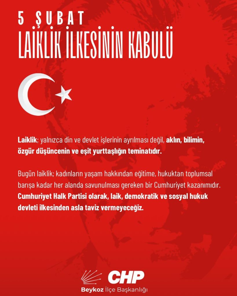 CHP Beykoz İlçe Başkanlığı, Laiklik ilkesinin Anayasa’ya girişinin 89. yıl dönümünde anlamlı bir açıklama yayımladı. Laikliğin sadece bir devlet ilkesi değil, aynı zamanda kadın haklarının ve toplumsal barışın teminatı olduğu vurgulandı.