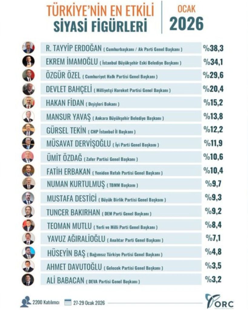 ORC Araştırma tarafından Ocak 2026 dönemine ait yayınlanan güncel veriler, Türkiye siyasetindeki en etkili isimlerin tam listesini ortaya koydu. 2200 katılımcı ile yapılan ankette, listenin ilk sıralarındaki isimlerin yanı sıra yeni kurulan partilerin liderleri ve kabine üyelerinin de listede yer bulduğu görüldü.